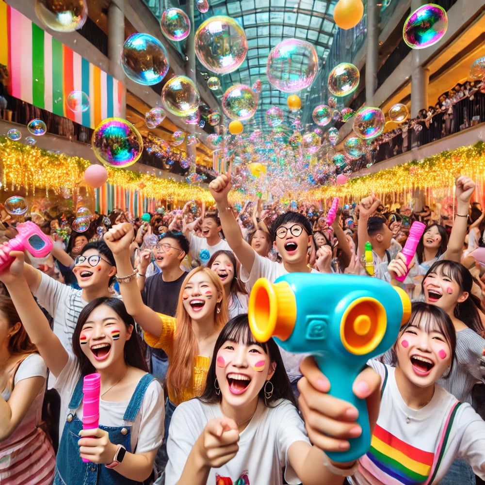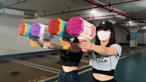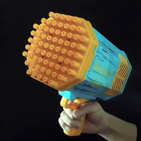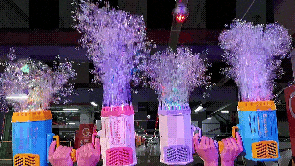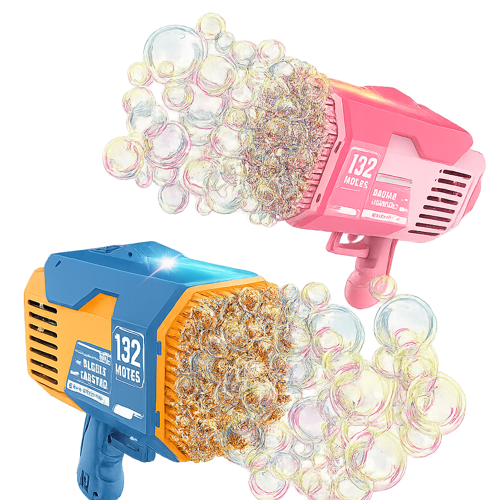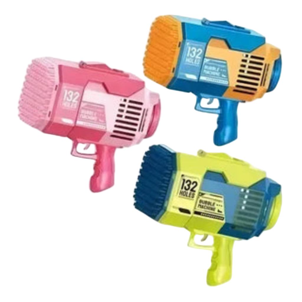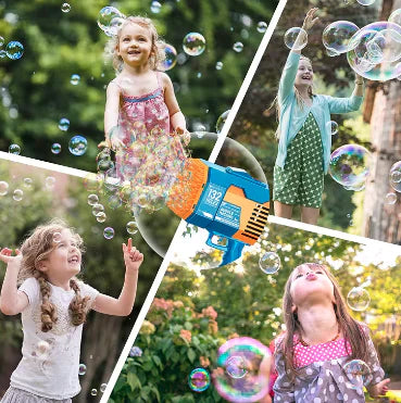 Imagina las sonrisas y risas de los niños mientras disparan burbujas brillantes y coloridas al aire.